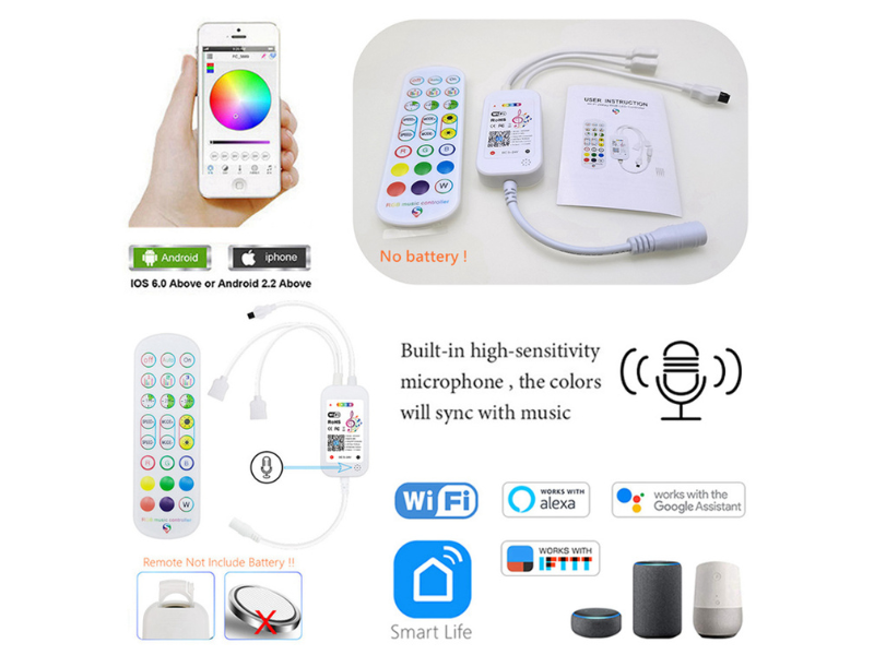 ريموت ومنظم سمارت واي فاي - مناسب لشريط الإنارة من 5- 24 فولت , 4 خطوط RGB , أكثر من 29 حركة مختلفة مع امكانية اضافة الحركات باللون والحركة المطلوبة , 5 حركات إنارة متفاعلة مع الصوت مع امكانية اضافة حركات اخرى , إضاءة ثابتة جميع الألوان , جدولة التشغيل والإيقاف , تحكم بلوتوث من خلال تطبيق Smart Life , قدرة التحمل 144 واط كأقصى حد -مرفق ريموت للتحكم - متوافقة مع جميع أجهزة الأوامر الصوتية الذكية مثل اليكسا وجوجل هوم وغيرها ....... - امكانية تشغيل اكثر من جاهز بنفس الوقت والتحكم بجميع الاجهزة من خلال انشاء مجموعة عالتطبيق - هذا المنتج غير شامل لشريط الإنارة و لا المحول .